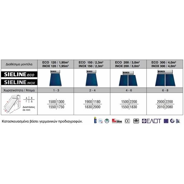 Ο ηλιακός θερμοσίφωνας SIELINE ECO 120lt/1,95m² είναι ένα πλήρως βιομηχανοποιημένο προϊόν που εξασφαλίζει υψηλή απόδοση, αντοχή στον χρόνο και αποτελεί μία εξαιρετικά συμφέρουσα επένδυση. O SIELINE ECO κατασκευάζεται στην Ελλάδα με τις πιο αυστηρές ποιοτικές προδιαγραφές και κατέχει τα ανώτατα Ευρωπαϊκά πιστοποιητικά SolarKeyMark.