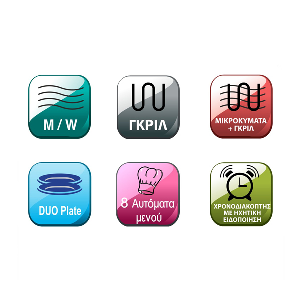 - Ηλεκτρονικός έλεγχος με 8 αυτόματα μενού μαγειρέματος και 11 βαθμίδες ισχύος μικροκυμάτων (0%-100%)