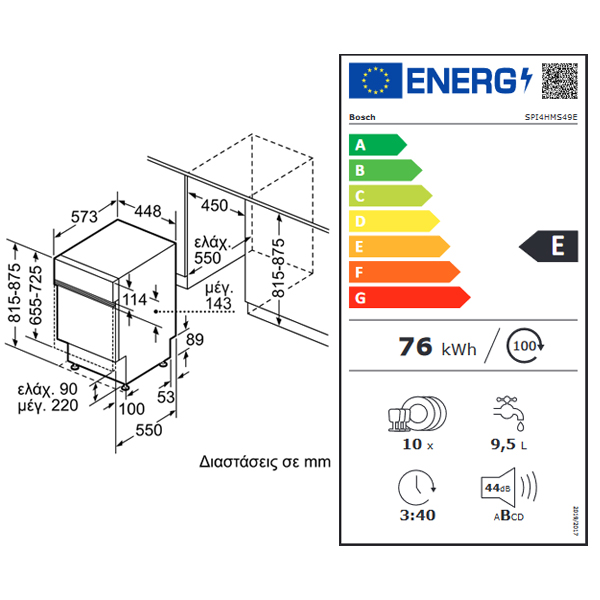 /Eντοιχιζόμενο πλυντήριο πιάτων BOSCH SPI4HMS49E Inox 45cm
