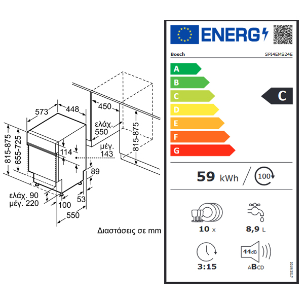 /Eντοιχιζόμενο πλυντήριο πιάτων BOSCH SPI4EMS24E Inox 45cm