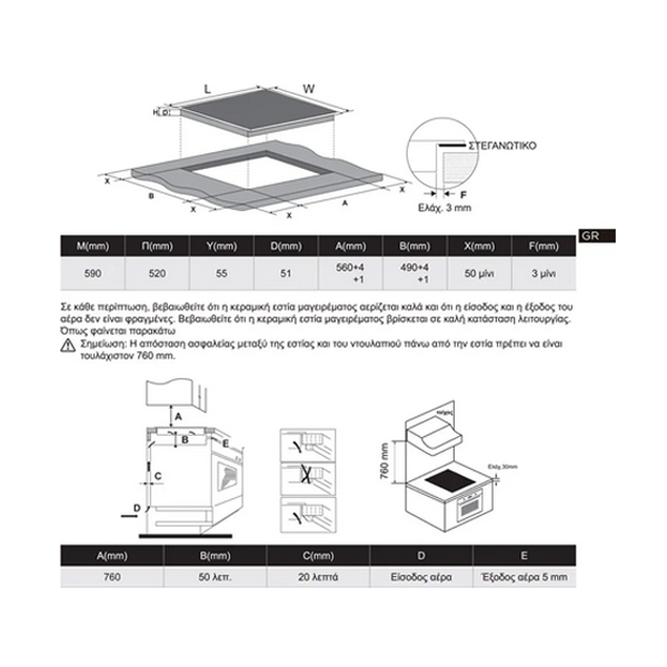 - Τεχνολογία: Εντοιχιζόμενη κεραμεική εστία 4 θέσεων (Dual) με αλουμινένιο πλαίσιο