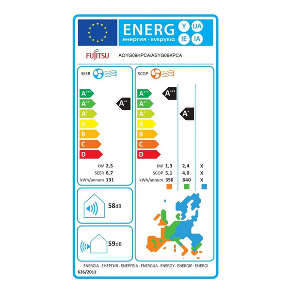 - EER Ψύξη: 3.52 W/W - COP Θέρμανση: 3.54 W/W